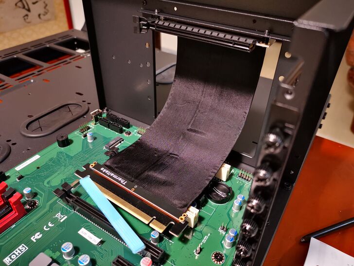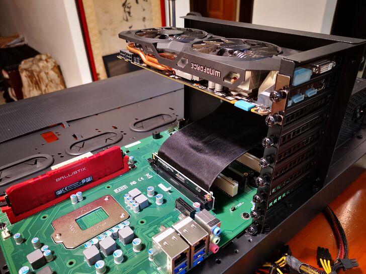 ▲就是透過買殼附送的這條PCI-E x16延長排線達到不直接插在主機板上!