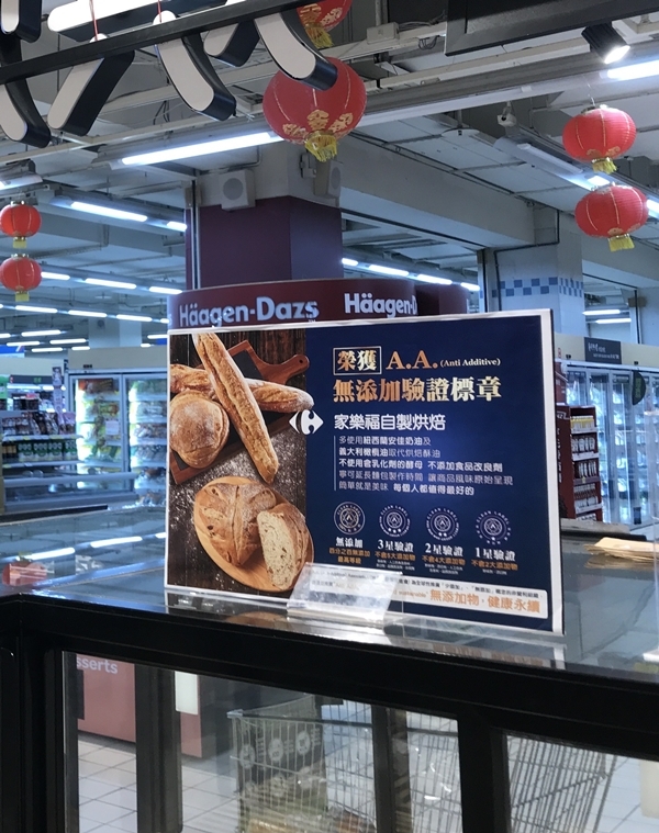 不少市售麵包含有添加物,容易造成健康危機。隨著消費者健康意識抬頭,家樂福自製烘焙的多款人氣麵包、吐司領先通路榮獲A.A.無添加驗証標章,讓消費者吃的更安心。以家樂福自製白吐司為例,使用紐西蘭進口安佳奶油、水、麵粉及酵母等原料,再以中種法長時間低溫發酵18小時製成,並通過A.A.無添加認證,為100% 無添加物之最高等級,只要認明包裝上藍色 A.A.無添加認証標章,就可安心選購、吃進食物的自然美味!