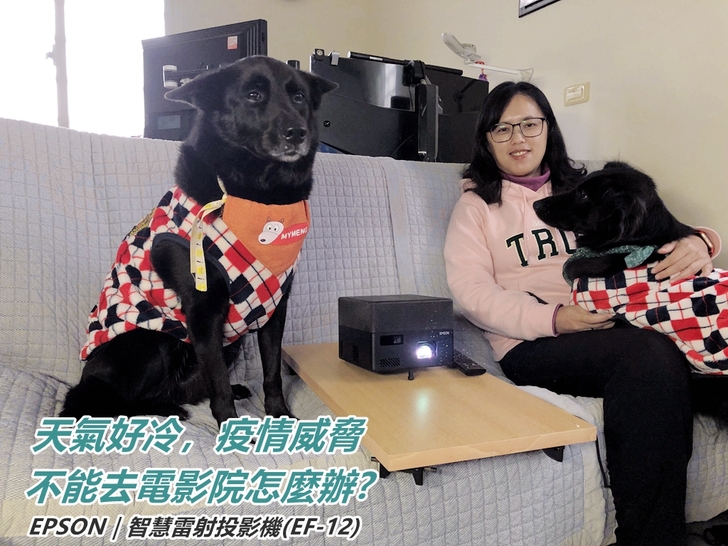 ▲這時我們可以用EPSON EF-12智慧雷射投影機來看電影吧!在家看電影,不用出門戴口罩,也不用頂著寒風刺骨,真的是太舒服啦!(重點還可以抱著狗狗看電影!XD)