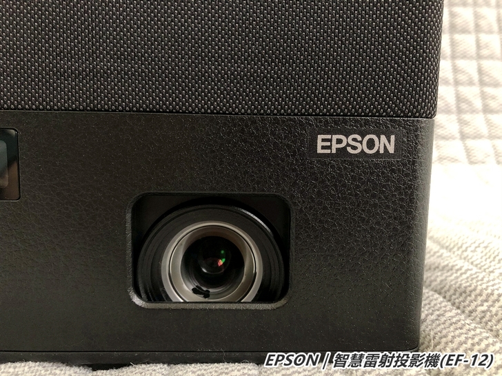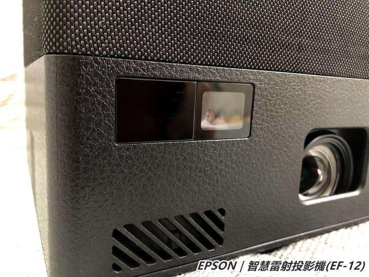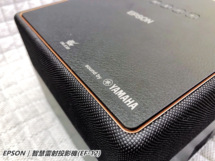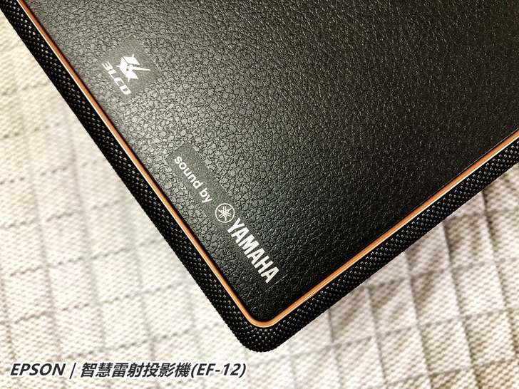 ▲這次試用的是EPSON這款全球體積最小、最輕巧3LCD智慧雷射投影機(EF-12),剛拿到手上時,看到外型,機身上方式採用類皮革的材質,黑色低調,外框鑲上一圈金色外圈,宛如一台高級音響的質感。