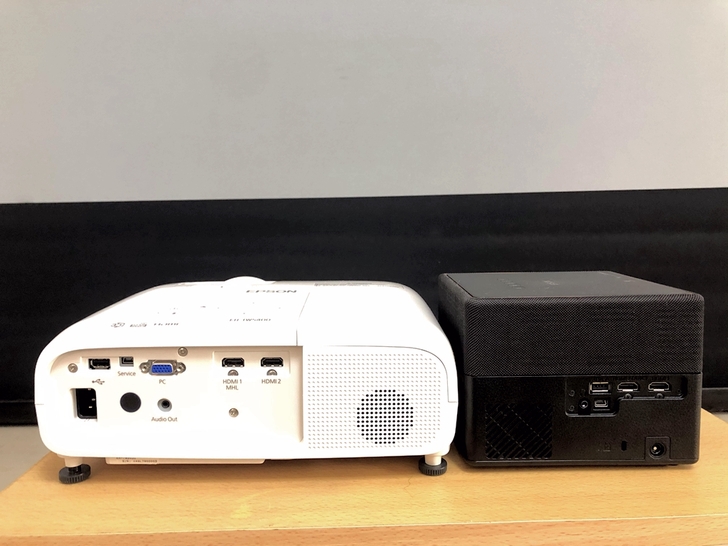 ▲EH-TW5400投影機與EPSON EF-12智慧雷射投影機連接介面比較,同樣都被至有二組HDMI介面、一組USB介面、一組音源孔,唯一不同的是EH-TW5400多了一組VGA介面。(EH-TW5400也有配置一個小喇叭,音質就是堪用的程度)