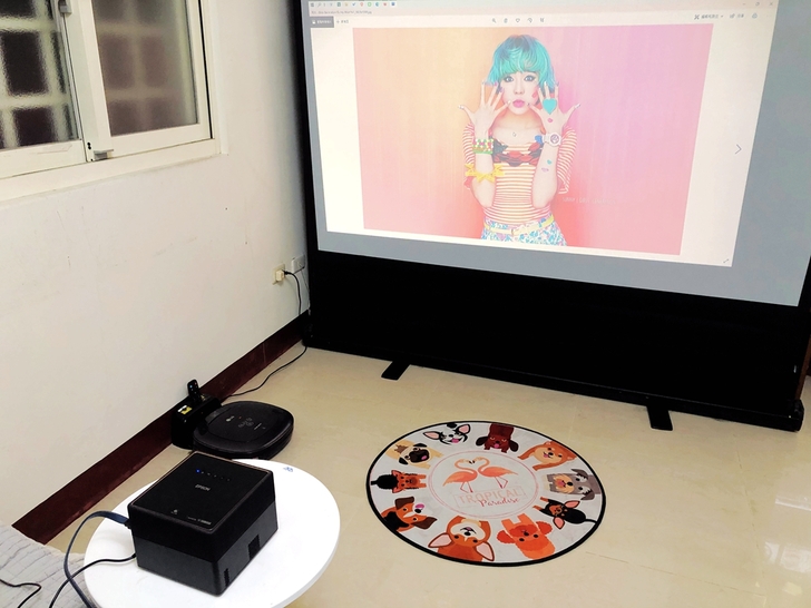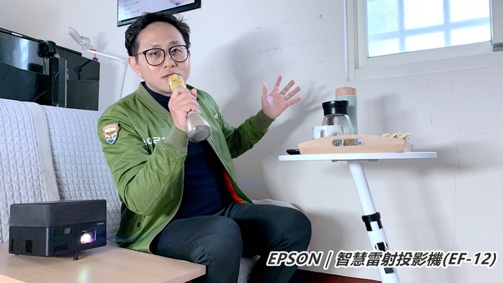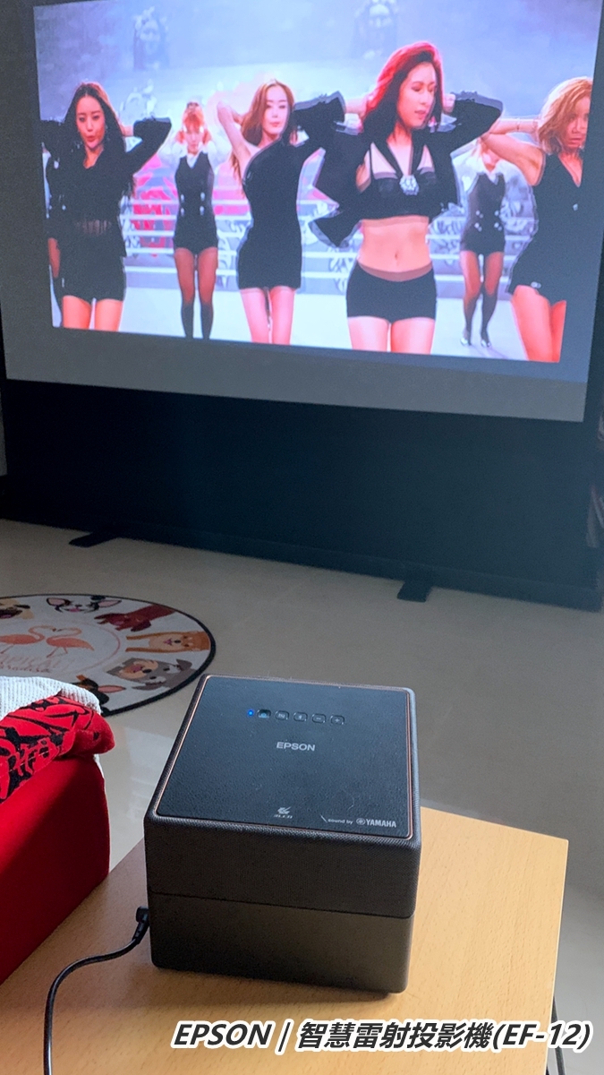 ▲拔比,你最近不是有試用EPSON|全球最小的3LCD 智慧雷射投影機(EF-12),我們用這個來唱歌、看電影吧!這樣就算不用出門,也可以看電影、唱KTV囉!