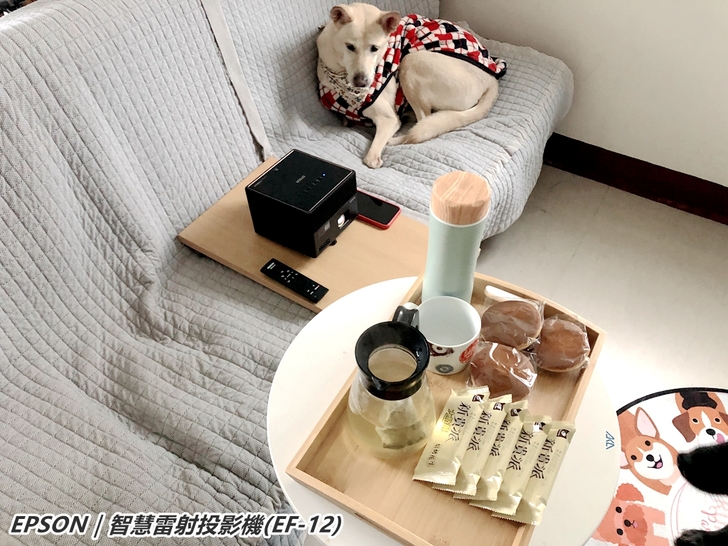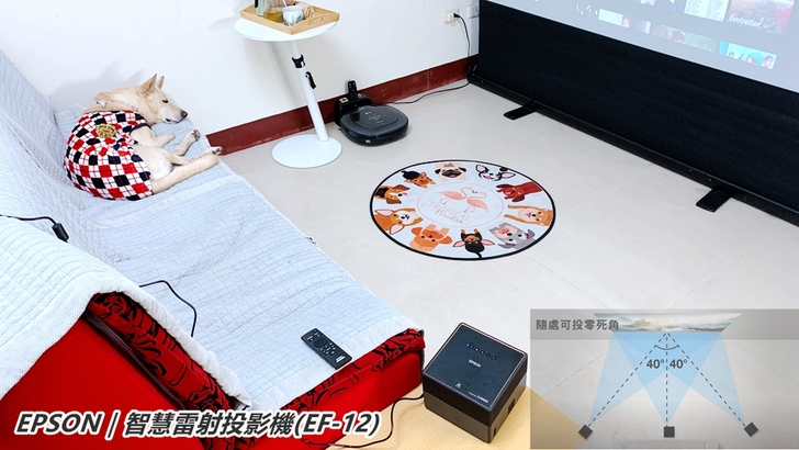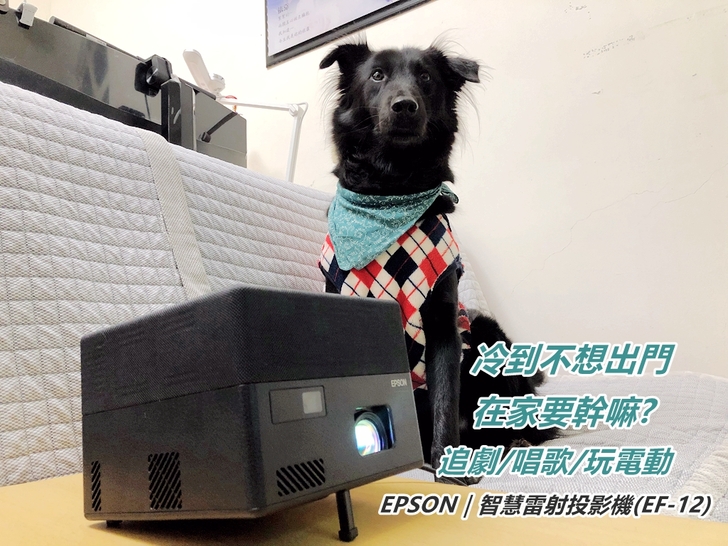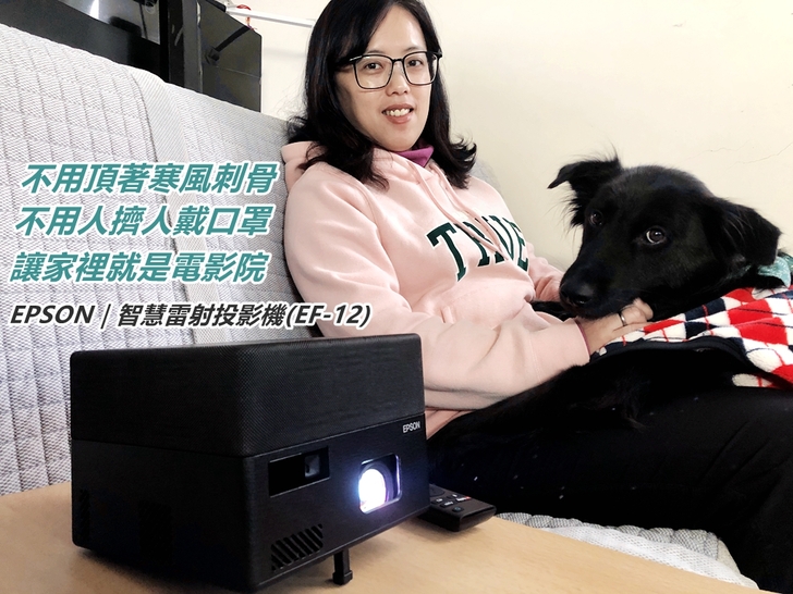 ▲這時我們可以用EPSON EF-12智慧雷射投影機來看電影吧!在家看電影,不用出門戴口罩,也不用頂著寒風刺骨,真的是太舒服啦!(重點還可以抱著狗狗看電影!XD)