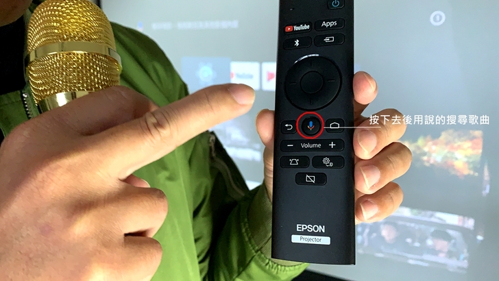 ▲EPSON EF-12智慧雷射投影機內建Android TV,所以附贈的遙控器均有支援google語音輸入搜尋功能!要唱什麼歌,用說的就能立即點歌喔。
