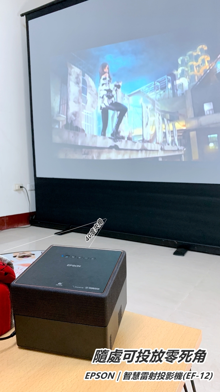 ▲EPSON EF-12智慧雷射投影機可以隨處投放零死角,「自動垂直梯形校正」功能真的很方便。