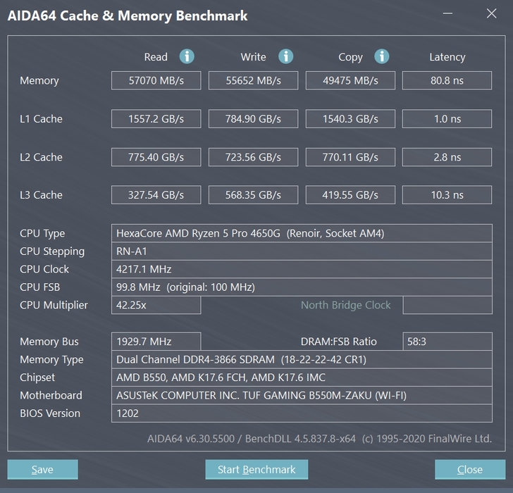 讀取57070MB/s 寫入55652MB/s 複製49475MB/s 延遲80