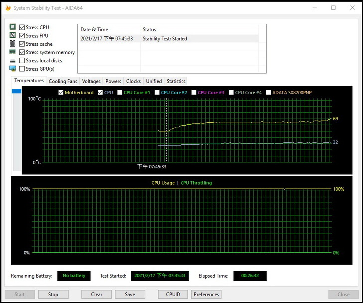 ▼ 使用 AIDA64 燒機26分鐘,可以看到 CPU溫度 大約是 32℃左右。
