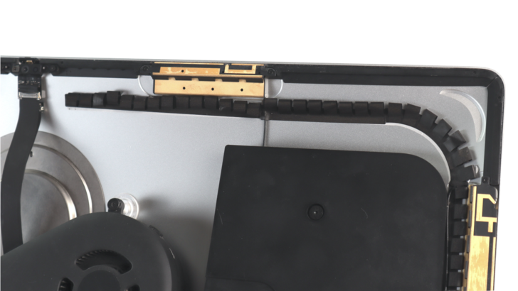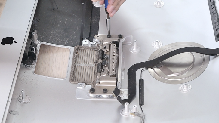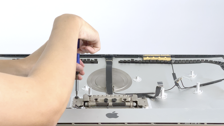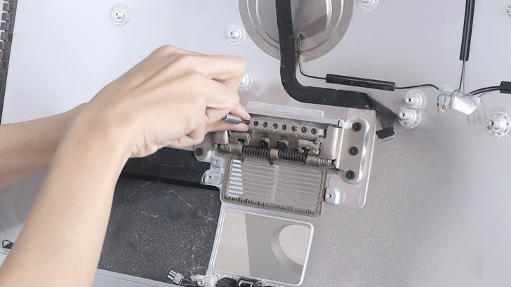 在前篇文章,已經教大家拆螢幕、喇叭、電源供應器、主機板、風扇,全部移除後,剩下主要的就是 iMac 機殼與支架。機殼與支架的連接,是一個鉸鏈樞紐的零件。機殼連接是左右兩側 6 顆較大的螺絲,與支架連接是 9 顆較小的螺絲,都要一一卸下。更換時不需動到壓制扭轉彈簧的兩顆螺絲。而這樣一個彈簧樞紐,上面就有 17 顆螺絲。