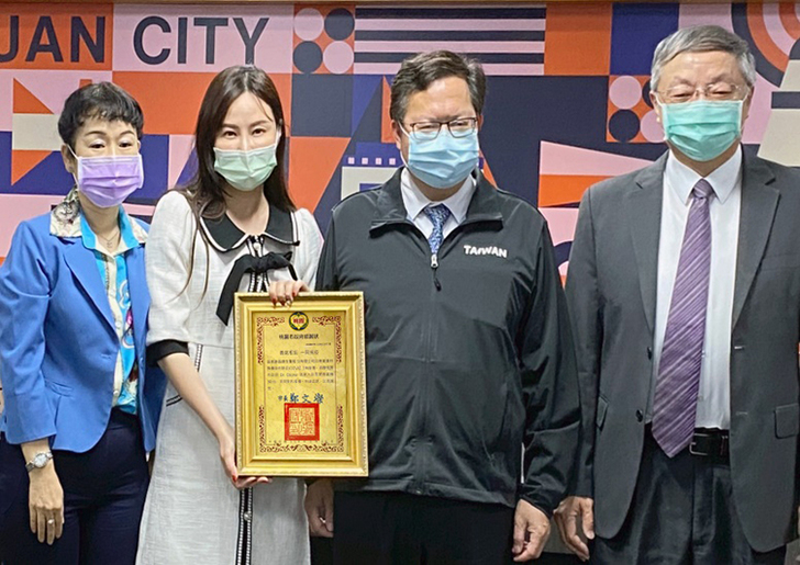 (由左至右:晶鑽生醫資深經理蕭淑華、晶鑽生醫董事長賴柏如、桃園市長鄭文燦、台北榮民總醫院桃園分院院長盧星華)