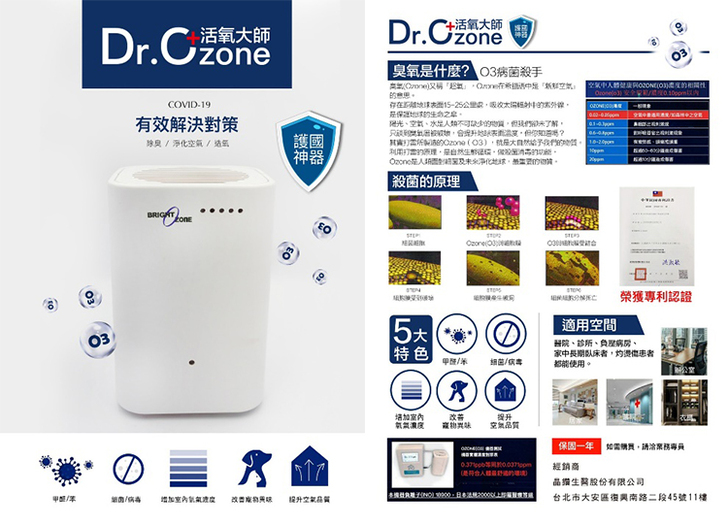 晶鑽生醫(6815)產品「DR.OZONE 活氧大師」,能有效釋放臭氧(O3)殺菌,讓消毒、殺菌、淨化一氣呵成,為全民打造一張安全的環境保護網,相較於台灣民眾已慣性使用的酒精、次氯酸水等其它環境清潔用品,「DR.OZONE 活氧大師」可廣泛運用在環境中各場域及空間,有效對抗肉眼看不到的病菌,讓消毒殺菌無死角,為全民防疫的一大助力。