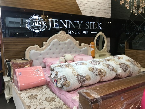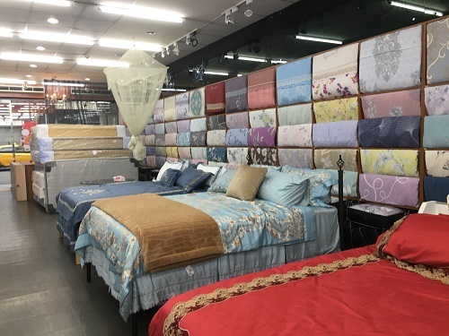 ㄧ進大門,左側有多張大床的展示。後方是一包包的床包。花色玲瑯滿目,素雅、華麗、可愛,各式風格一應俱全。