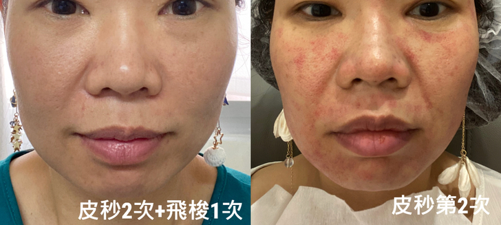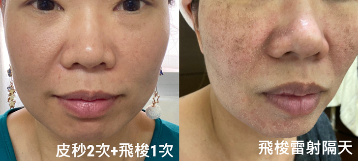 飛梭雷射:飛梭雷射肌膚燒灼感比較強烈,有換膚效果能將痘疤淡化,個人覺得針對膚質痘疤較多的人很適合,打完飛梭雷射當天肌膚表層會變得非常粗糙,很像菜瓜布一樣粗粗地,隔天臉上很明顯看到有許多黑色結痂物,晚上洗臉碰水後就會慢慢脫皮,大約3-7天結痂就會完全脫落,在換膚過程的