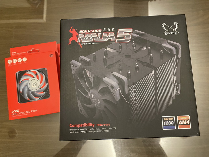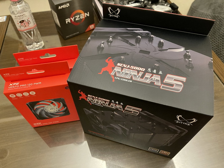 新入手的Scythe忍者五,旁邊的是打算裝在機殼內的溫柔颱風,這也是看網路上有人說才知這麼厲害,不便宜但還是要弄來玩看看