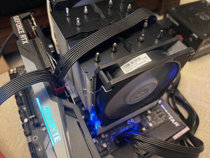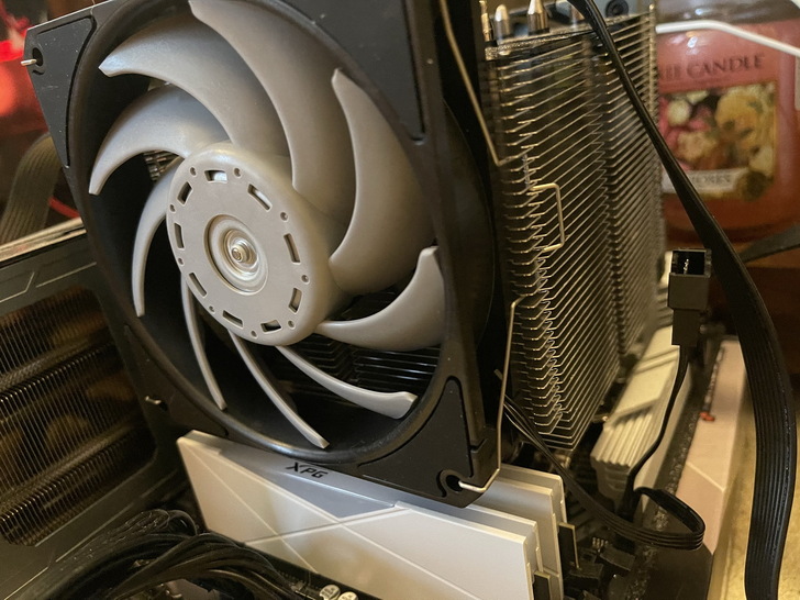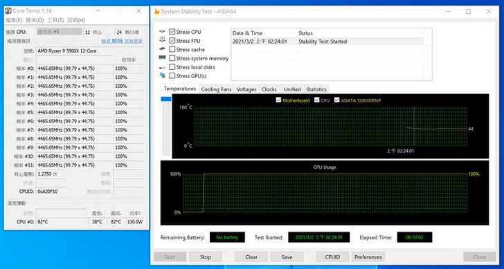 用燒機軟體讓CPU全部核心100%負載,最高溫大約在82度左右,印象中5900X全速應該是在90度左右,這表現應該還算可以吧?且忍者五的風扇全速也才8XX轉,小弟是覺得滿安靜的