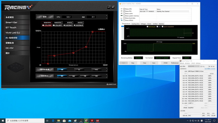 用燒機軟體讓CPU全部核心100%負載,最高溫大約在77度左右,此時風扇依系統設定約為16XX轉,有明顯噪音出現,若裝在機殼內應該也可以感受到風扇的聲音