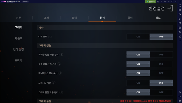進入遊戲後首先就是調整遊戲設定,想看漂亮點就把畫質調高,想多開就把畫質調低,韓服的看不懂韓文還可以改成英文