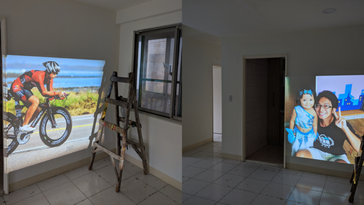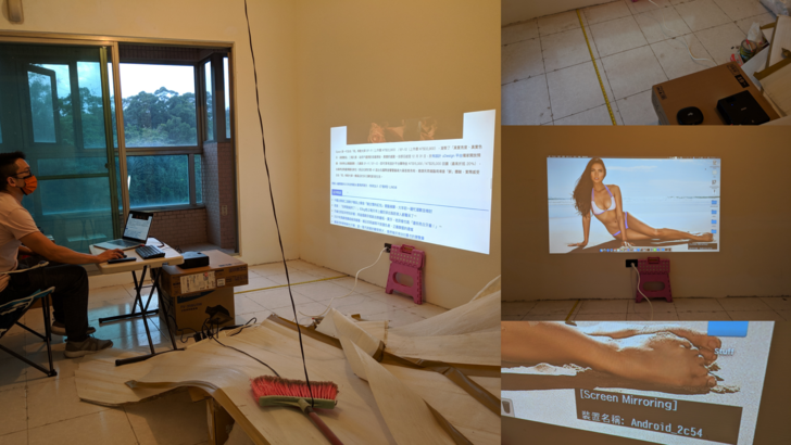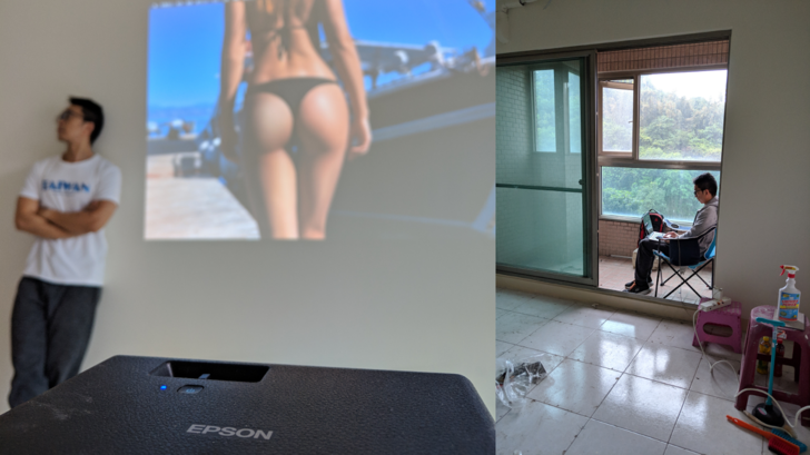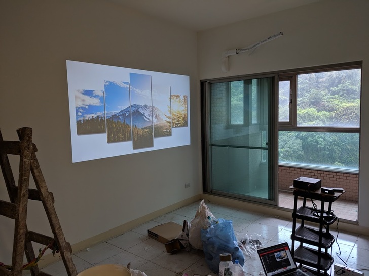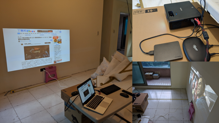 帶上一張露營椅+行動桌,隨便找幾個箱子墊一墊就能在這凌亂的客廳裡開工!多虧這麼一照,讓我原本對於添購65吋液晶電視的不安感(擔心距離太近)完全消失。以上圖為例,投影機與牆面的距離大約是150cm左右(地上有量尺),而牆上的145cm寬度就剛好與電視一致,為了能夠充分模擬擺在心電視櫃上的高度,我甚至還讓折疊椅也派上用場,整套擺完之後坐在露營椅上的我終於鬆了一大口氣,也更能確定未來家電添購的尺寸考量。