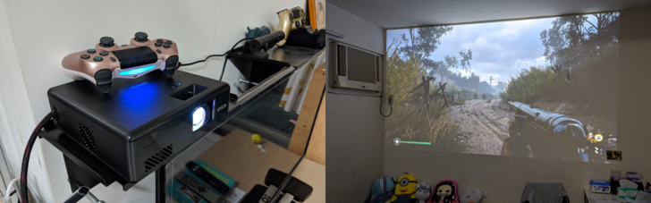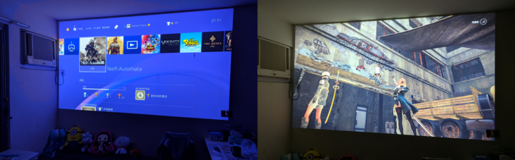 每個擁有PS4又喜歡露營的人相信都應該有著共同的期盼,就是如果可以在荒郊野外的夜晚跟在2B背後一直不斷地爬樓梯的話,那該有多麼夢幻?! 趁著即將離開舊家的前夕(在本文刊登後大概就已經搬入新家了),我也心生一念直接把EF-11放在電視頂架上往反向的牆壁投射過去。噹噹~ 完全可以支援PS4啊啊啊啊啊啊啊!!!