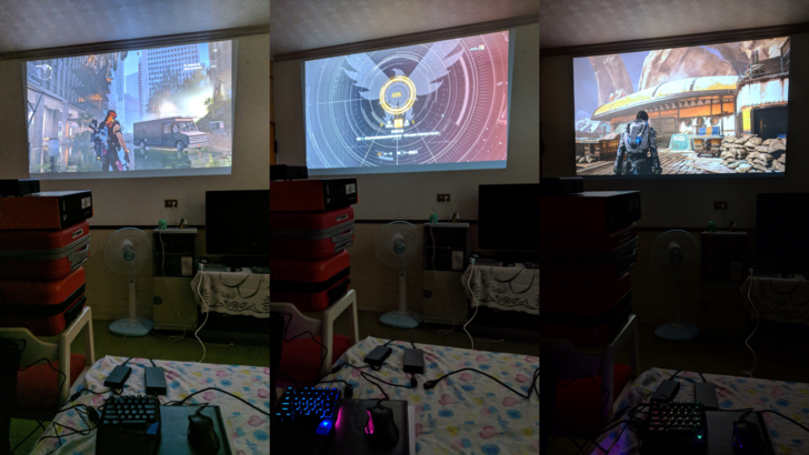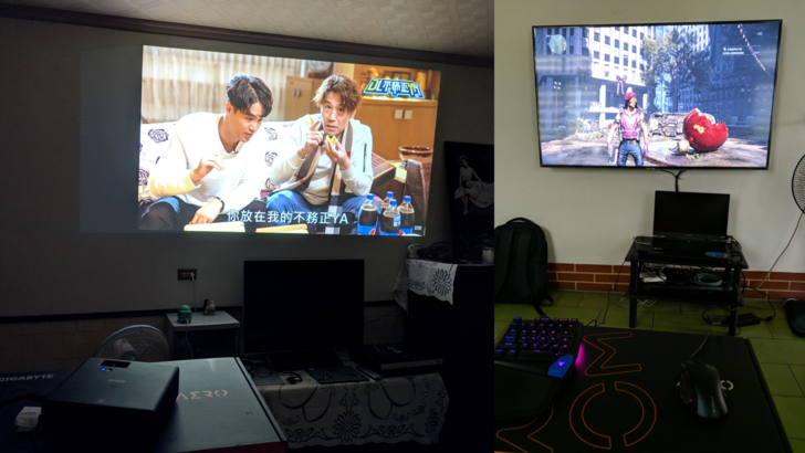 左邊為EF-11,右邊為老投影機。除了畫質的明顯差距之外,在全暗環境下的亮度表現也充分地說明了世代交替的必要性。即便再把室內燈光打開,EF-11的可視程度仍是非常地高。