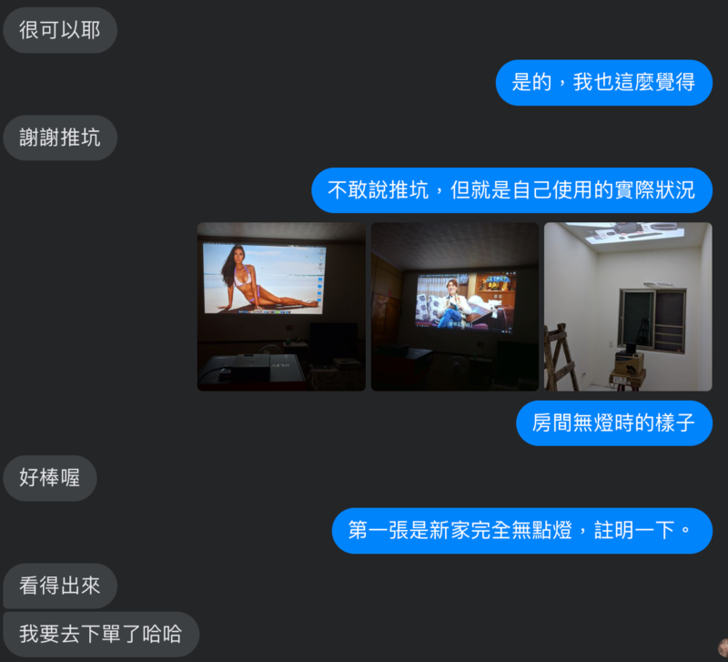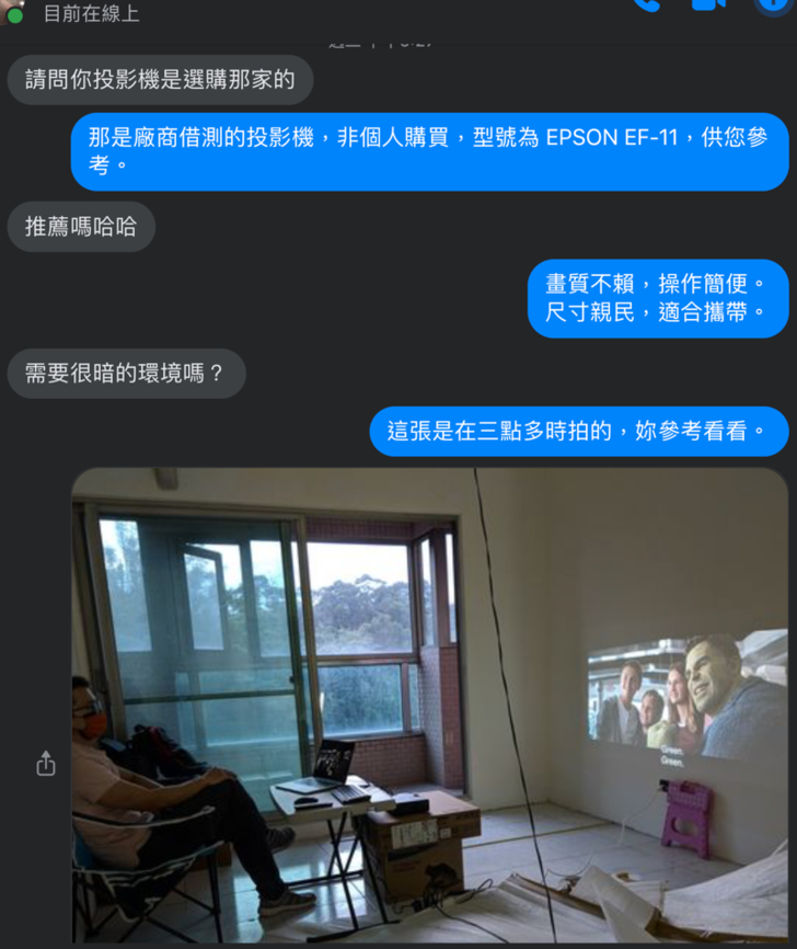或許以上心得對特定玩家來說並無太大的震撼或是吸睛,事實上以一個『只有在露營的過夜那晚才會把投影機拿出來用的使用者』來說,EF-11帶過我的升級感受已是相當地明顯,甚至我也才在自己臉書貼上幾張照片後竟也意外地吸引到幾位朋友的詢問,沒想到友人光是看到以下這張在下午三點左右拍的實境照片之後,就跟我說她要去下單了,哈哈… 真希望我也可以像她這麼衝動!
