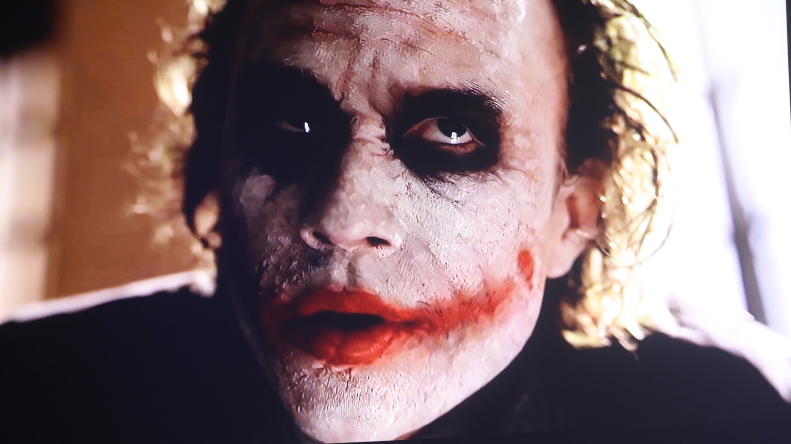 ▲蝙蝠俠:黑暗騎士的一幕,注意畫面右方的高光處和畫面左方小丑臉的陰影,實際上看起來時,左邊的陰影部還更亮,右邊高光處也沒那麼亮