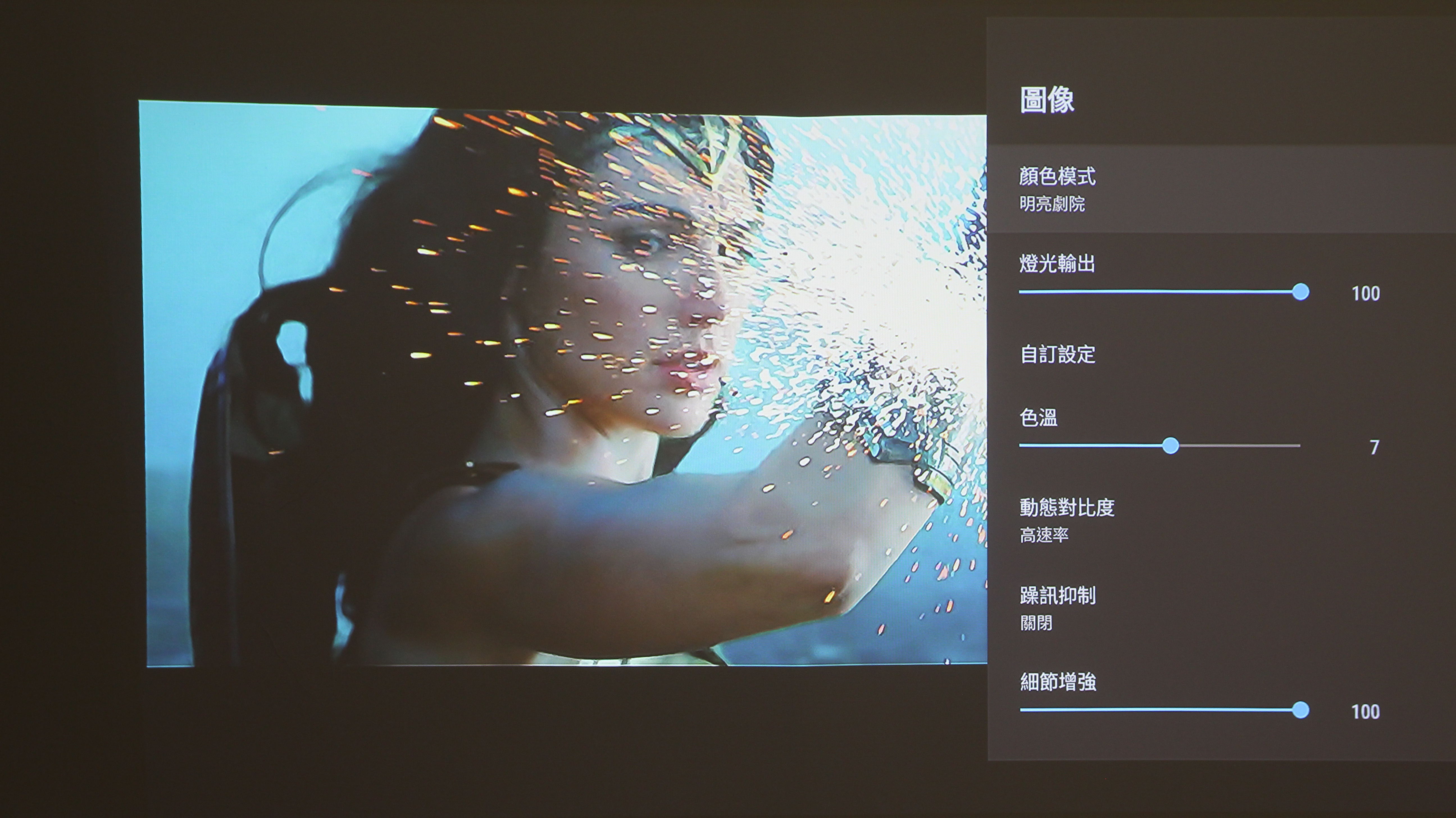 畫質上,EF-12的投影元件原生支持的投影畫質為Full HD(1080p),但是訊號源支持到4k,使用4k的訊號源時,會比直接用Full HD來源的畫質好,並且支援了HDR的影片,此外,EF-12雖然體積嬌小,但內容可不含糊,內建了五種色彩模式,色彩模式和HDR的效果可以參考下面的圖,不過這裡筆者還是建議直接去現場看,因為相機翻拍畫面和看到的會有落差。