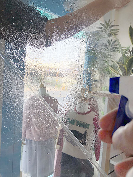 (2).貼前玻璃清潔一定要撤底,噴水+刮水的動作反覆作到乾淨,窗框周圍的灰塵也要擦拭乾淨,塵絮才不會飄進膜裡面