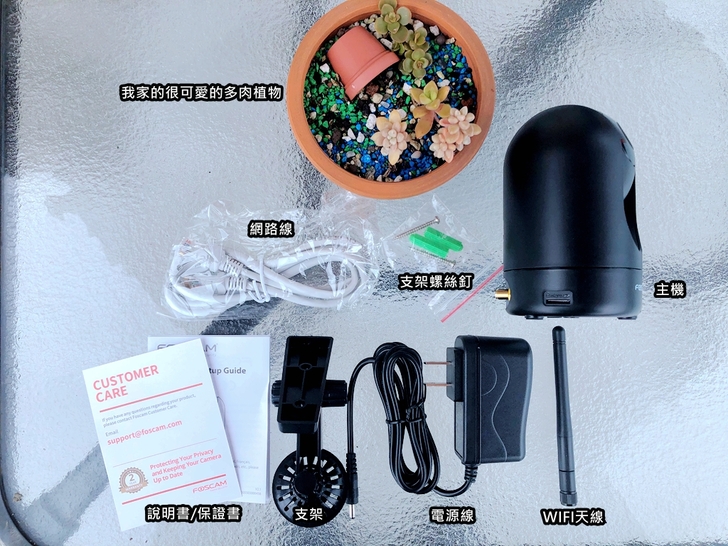 ▲【FOSCAM】R2M 1080P 可旋轉式網路攝影機的配件很簡單,就是電源線、WIFI天線、網路線、支架、保證書/說明書,然後就沒啦~