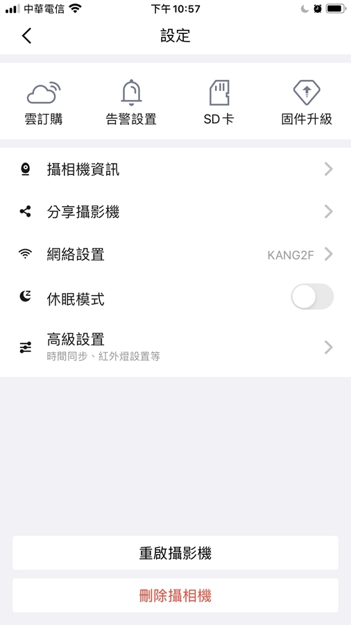 ▲接著就會進入設定介面,這裡可以進行功能設定,像是:位移/聲音偵測、AI人體偵測、雲端儲存及回放、網路設定、攝像機資訊等功能。