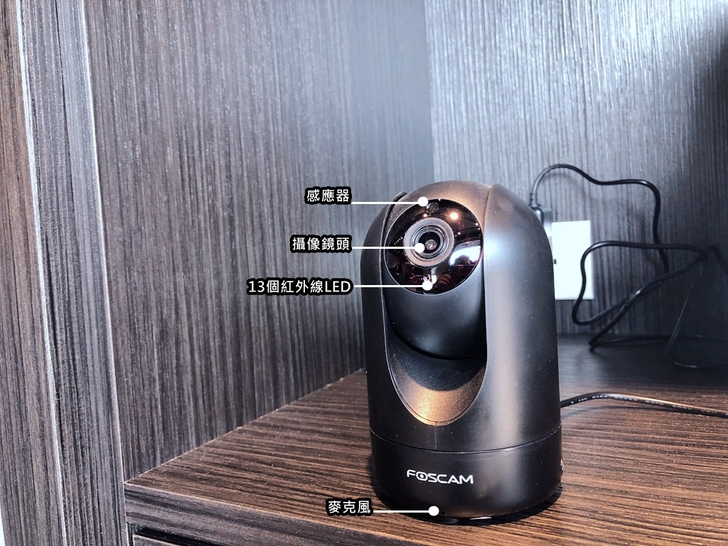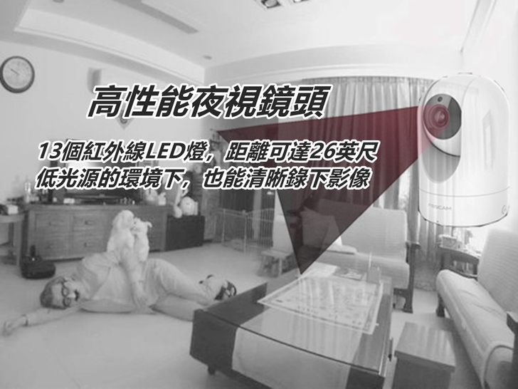 ▲【FOSCAM】R2M 1080P 可旋轉式網路攝影機的鏡頭周圍配置有13組的紅外線LED燈,距離可達26英尺,就算低光源也能清晰拍攝錄下影像。