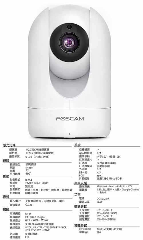 ▲【FOSCAM】R2M 1080P 可旋轉式網路攝影機規格表
