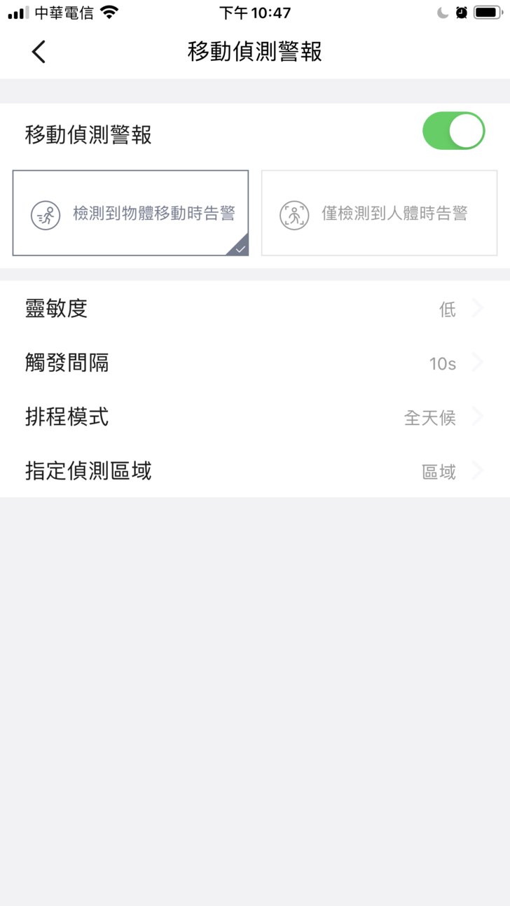 ▲可設定物體移動警告、人體移動警告,也可以設定靈敏度、觸發間隔、日期時間排程、指定偵測區域。