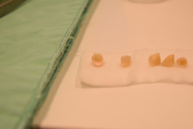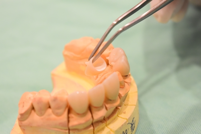 醫師先是用器械將附著牙橋上面的黏著劑清除