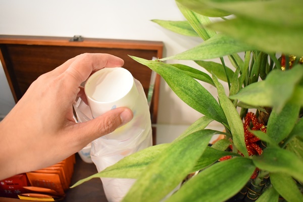 一旁流水潺潺將牆面上綠蔭盆栽養得青綠