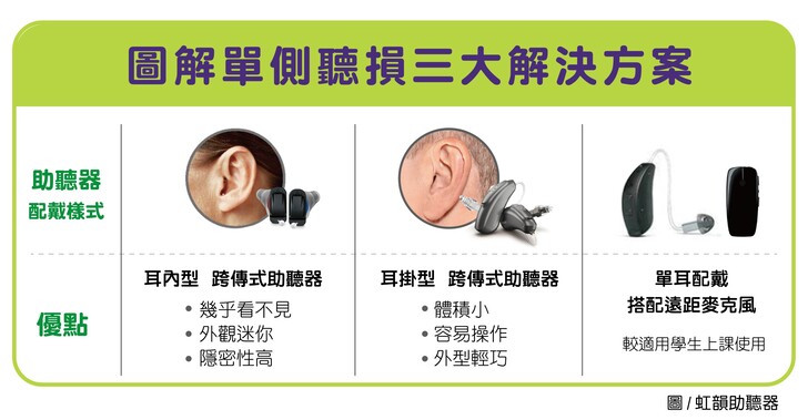 單側聽損也有分單耳、雙耳助聽器,不知道怎麼選擇?聽力師黃妤茜表示,選擇雙耳配戴跨傳式助聽器,可讓來自劣耳方向的聲音傳遞到優耳來聆聽,比起單耳聆聽範圍更廣,接收也能更全方位。若需要隱密性且對聲音清晰度有要求者,可選擇雙耳內型跨傳式助聽器;若長時間需要開會,可選擇聲音處理細膩度高的雙耳耳掛型跨傳式助聽器,還能搭配藍芽連接手機使用,符合一般職場上溝通的需求;若是多在課堂上室內的使用,可選擇單耳型助聽器,搭配遠距麥克風接收器,不管台上講師距離多遠,都能保持良好的聆聽效果,至於助聽器需要配戴至哪一耳比較合適,虹韻聽力照護專家會提供專業評估。