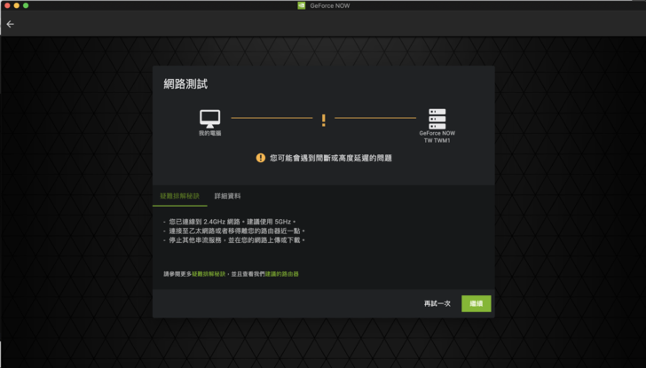 摸摸鼻子回來 GFN,進入遊戲之前還貼心地幫我看一下網路夠不夠力,看起來好像不太夠力,結果還是改用 5GHz 的 Wifi 來連線,後來發現照原本網速也可以順跑。