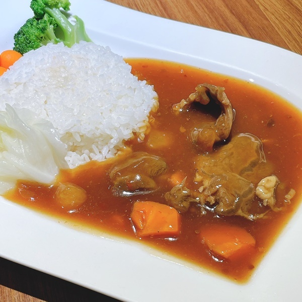 吃起來像台式咖喱,份量十足,雞肉半嫩半柴,有微微碎骨,一旁有水煮花椰菜以及迷你紅蘿蔔好吃多汁沒有紅蘿蔔可怕的味道!推薦唱歌前去點一份來吃!