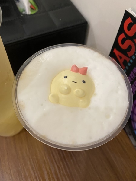 這個超特別!很好喝!咖啡很香濃郁跟牛奶完美的搭配!上方還有超可愛糖霜製成的角落生物小恐龍造型漂浮物!喝起來療癒一下自己!也提起一整天的精神!活力滿滿!