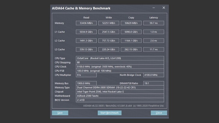 後來進一步嘗試在不增加電壓的情況下提高時脈,最後定在 3800MHz 可以穩定開機、完成測試。讀取達到 53,436MB/s,寫入達到 52,251MB/s,延遲為 59.7ns。