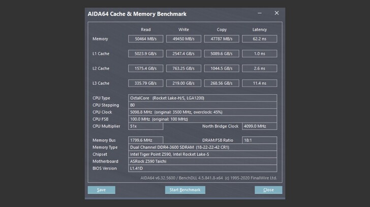 首先在 BIOS 中打開 XMP 設定,在系統中即可以看到時脈達到 3600MHz。讀取速度突破 50,000MB/s,寫入速度也在 50,000MB/s 左右,延遲為 62.2ns。