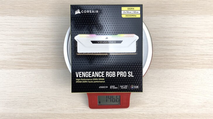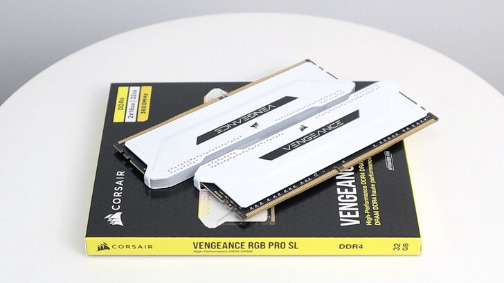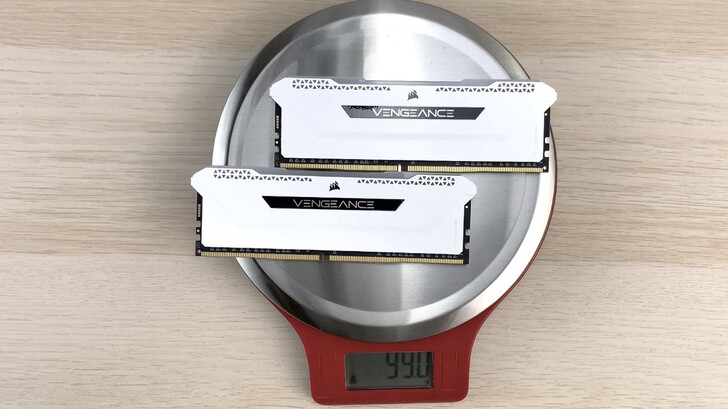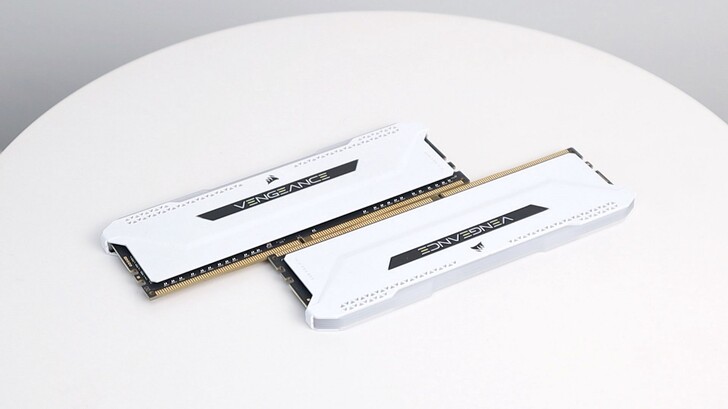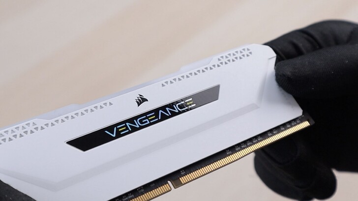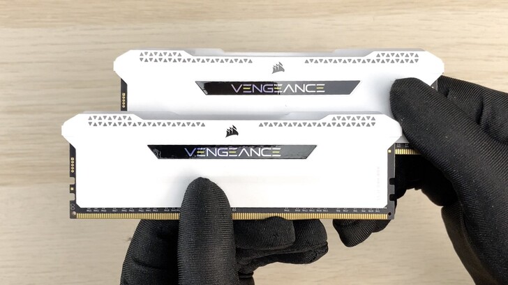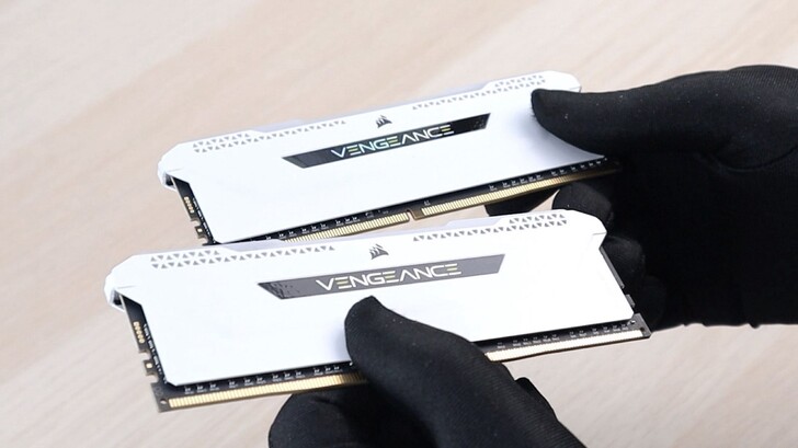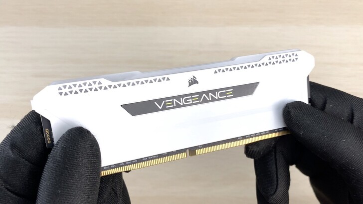 拿出記憶體,外殼白色的程度算高。上面有 CORSAIR 的 Logo 和 VENGEANCE 字樣。