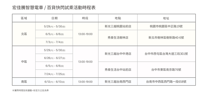 為了讓民眾親身騎乘上路體驗宏佳騰智慧電車兼具智能與完美操駕的獨特魅力,宏佳騰將於5月起陸續於北中南新光三越、秀泰生活百貨舉辦快閃試乘活動,試乘體驗再贈送專屬限定好禮,歡迎有興趣的民眾現場報名參加。更多活動資訊及購車優惠,請見宏佳騰智慧電車官網與官方粉絲團。