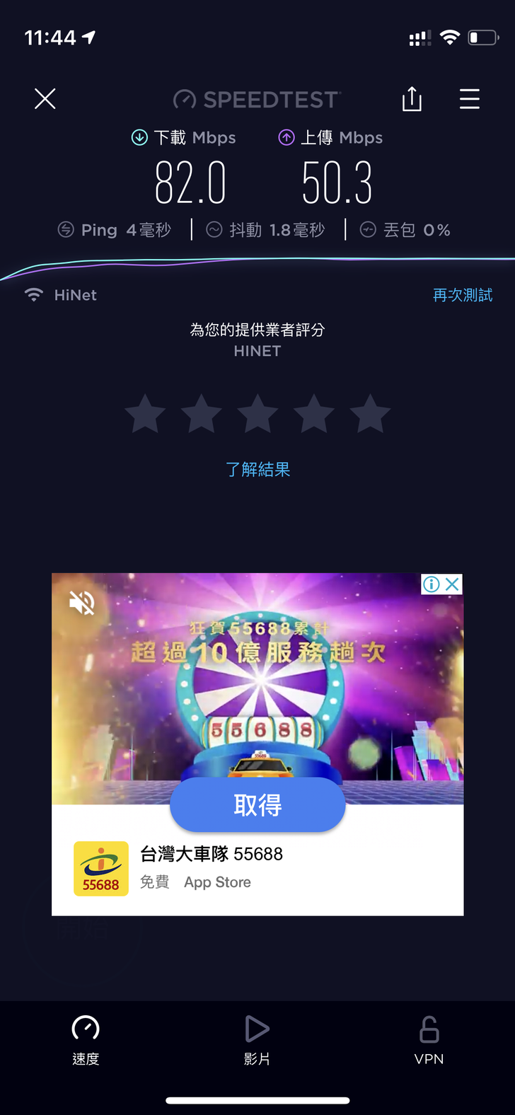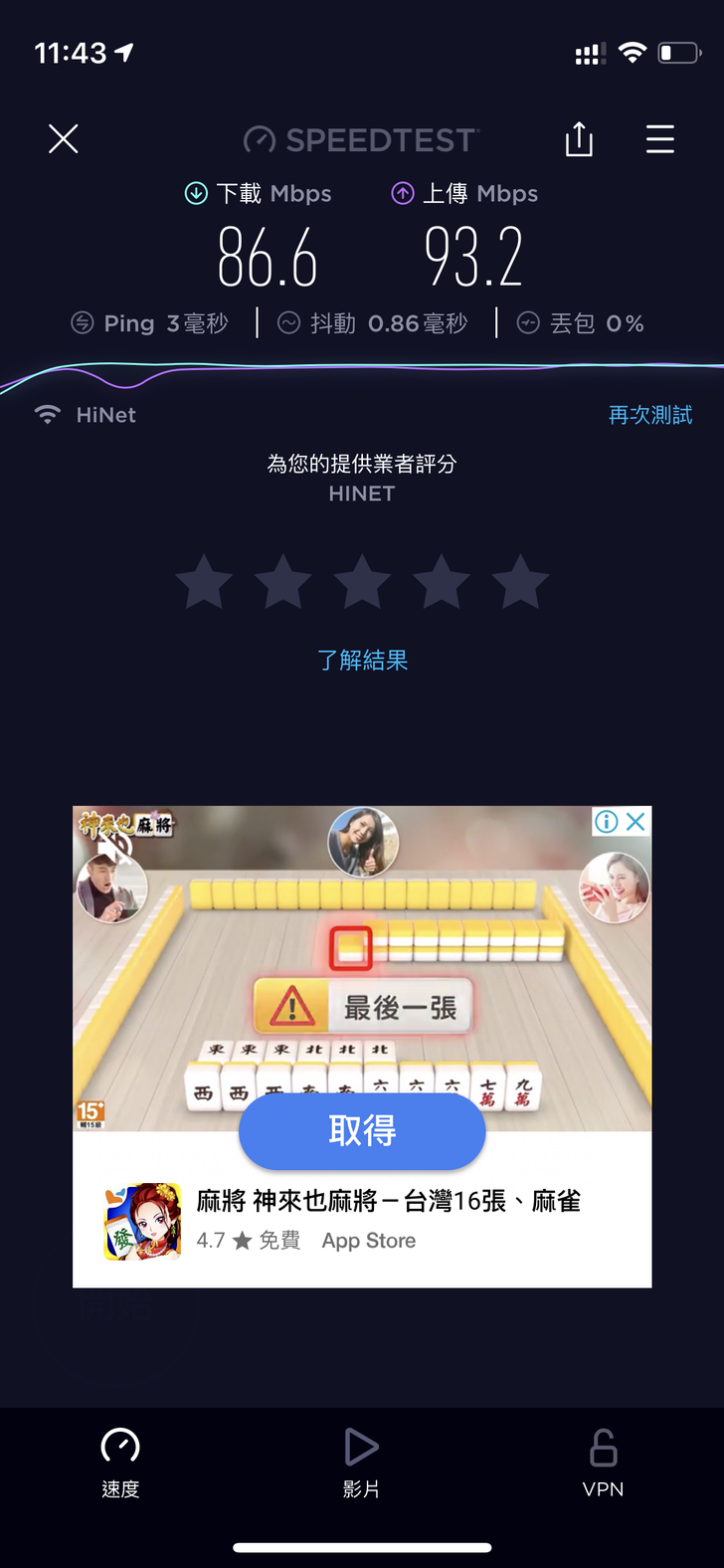 手機所顯示的畫面沒有過多文字, 以圖形按鈕顯示居多, 直接開 SPEEDTEST 測試一下上傳下載都逼近 100M (實體線路限制在100M, 而家中有使用MOD, 所以在下載部分會被吃掉一些頻寬XD)