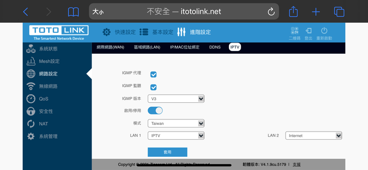 前面有提到家中是使用 MOD, 不是萬惡的第四台, T6 MESH 也有支援 IPTV的功能, 但要切換至電腦版介面, 進入網路設定中的IPTV 分頁將功能打開即可.