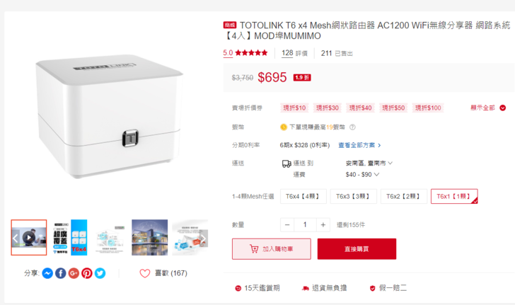 目前入手的這個是雙入組合, 看說明書上的講解好像是可以再購入單顆 T6 來擴充 MESH 的網路範圍, 但不太確定能否支援 4 個以上, 因為在蝦皮上確實有看到有賣家直接賣 4 個 T6 的組合包, 就等下次蝦皮雙6節再來買一組再來試試看了, 以上是這次入手 TOTOLINK T6 MESH 雙入組的心得分享, 感謝收看.