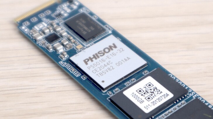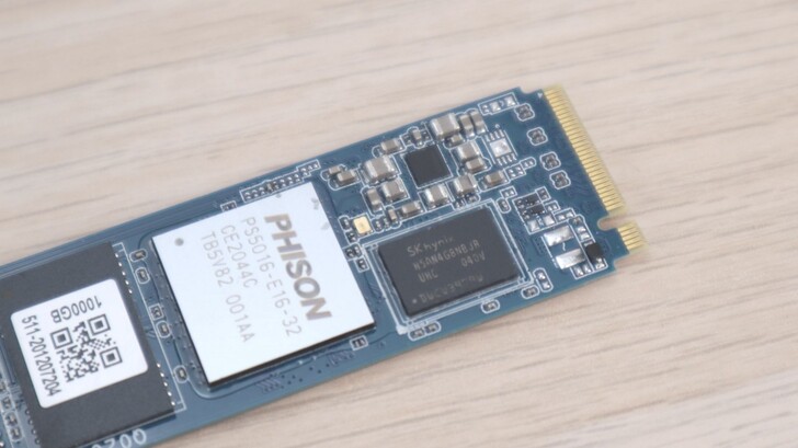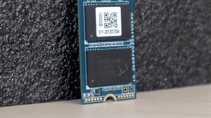 儲存顆粒上印有 TABBG65AWV,為 Toshiba 3D TLC NAND,總共有四顆。其中上面貼有 1000GB 的貼紙,還有似乎是手寫的 1TB 標記。