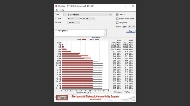 在 ATTO Disk Benchmark 中,可以看到寫入速度穩定在 3950MB/s,讀取速度則在 5200MB/s 左右。