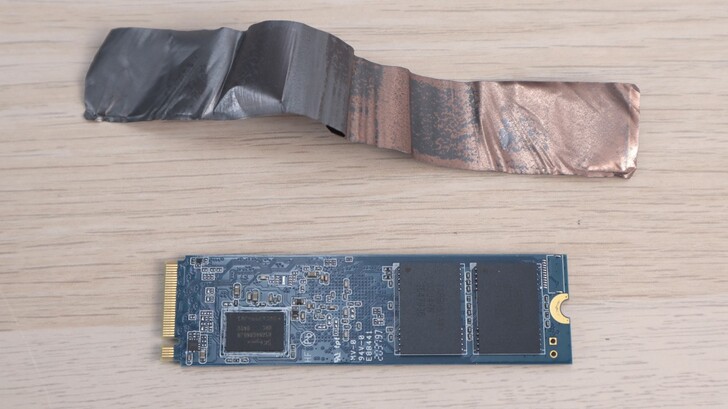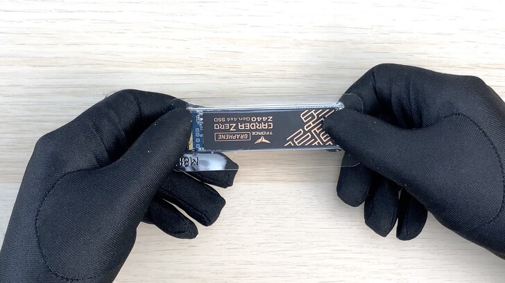 測試完數據後就把石墨烯銅箔拆下,可以看到十銓特殊的疊構技術將石墨烯、銅箔、絕緣層進行膠合。