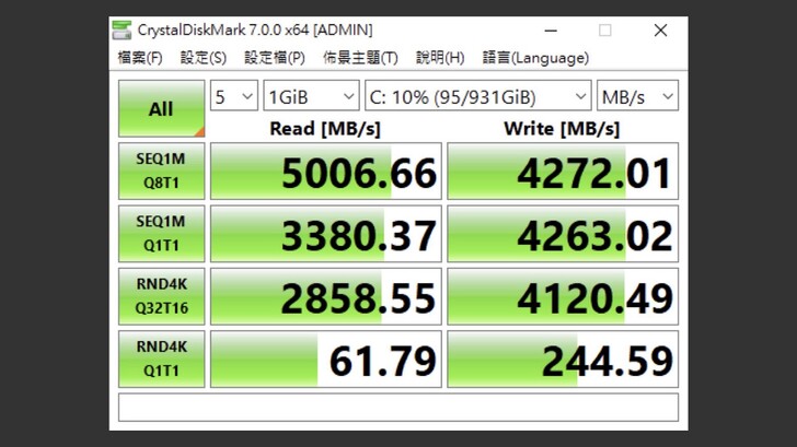 在 CrystalDiskMark 中,循序寫入速度突破 5,000MB/s,測量多次也都穩站 5,000MB/s 大關,循序寫入速度則在 4200MB/s 上下。相較官方標示的讀取 5000MB/s 和寫入 4400MB/s 差距不大。