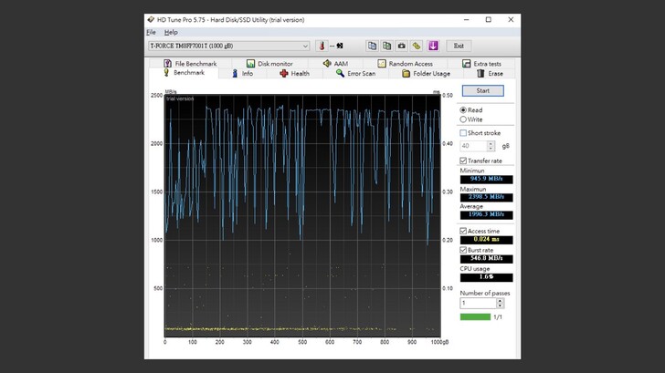 在 HD Tune Pro 的效能測試中,讀取模式下,可以看到線條起伏非常大。最小值 945.9MB/s,最大值 2398.5MB/s,平均值 1996.3MB/s,Access time 0.024ms。